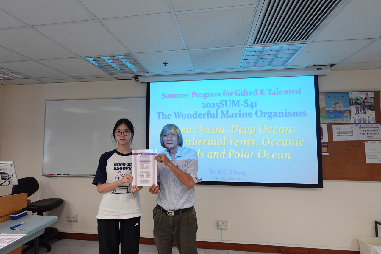 本校柳希雯、歐楊愛慈、蔡紫涵、程芷瑩、賴柏燊、羅詩媛、施依辰、陶海盈、楊玉琴、丁俊哲、魏殷涵及陳凱敏同學於暑期參與了由香港中文大學教育學院舉辦的暑假資優課程,內容涵蓋數學、物理、心理學、人體素描、宇宙探索、中醫藥、醫療科學及海洋生物等範疇。課程能滿足學生對傳統及非傳統學科的興趣,讓同學進一步認清升學方向,為自己訂立更清晰的大學目標。