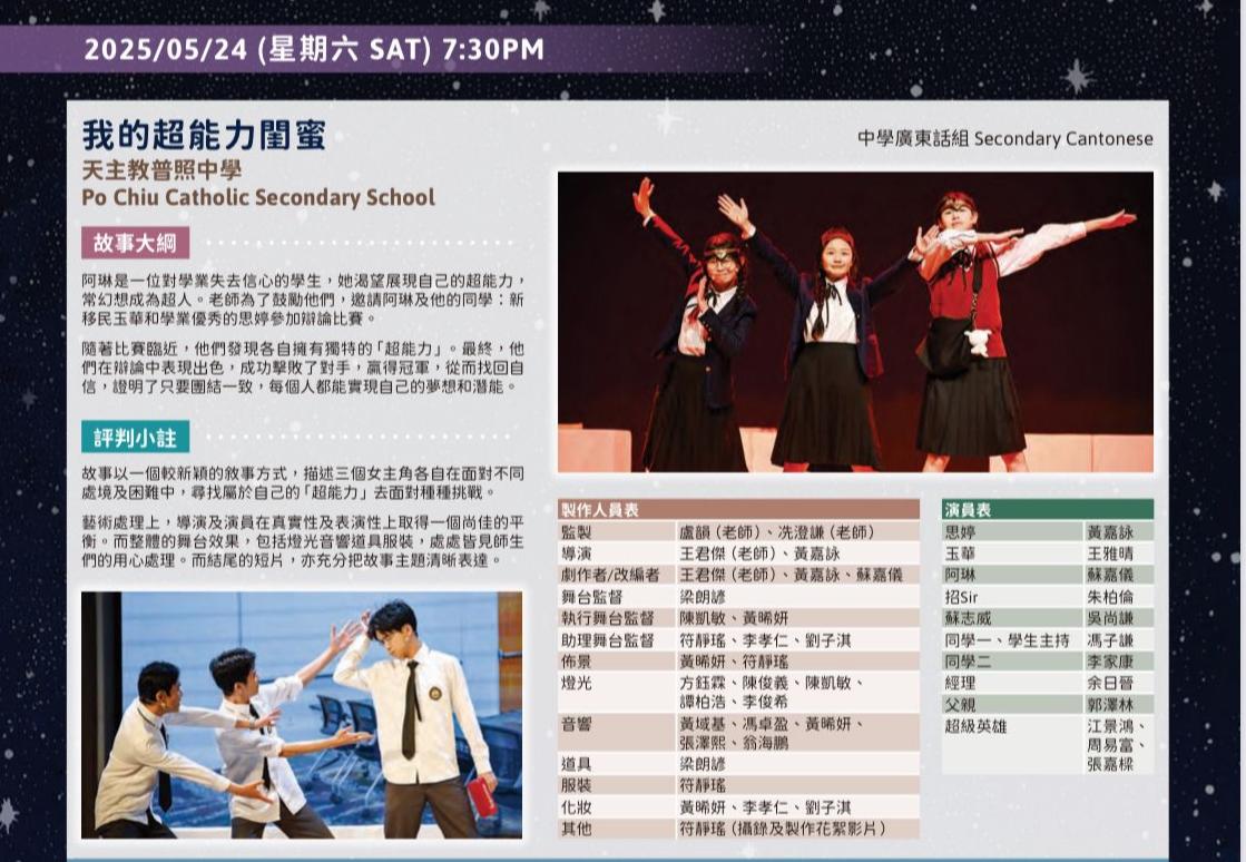 本校劇社於「香港學校戲劇節2024 – 2025」屢創佳績,憑原創劇《我的超能力閨蜜》連續第三年奪得戲劇節最高殊榮──「評判推介演出獎」,並獲邀於2025年5月24日到西灣河文娛中心作公開演出。此外,本校亦同時獲得「傑出劇本獎」、「傑出導演獎」、「傑出演員獎」、「傑出合作獎」及「傑出舞台效果獎」,恭賀以下獲獎同學: